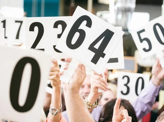 A live fundraising auction sees event guests bid for items by raising their hand or a paddle to raise funds for a non-profit organisation.