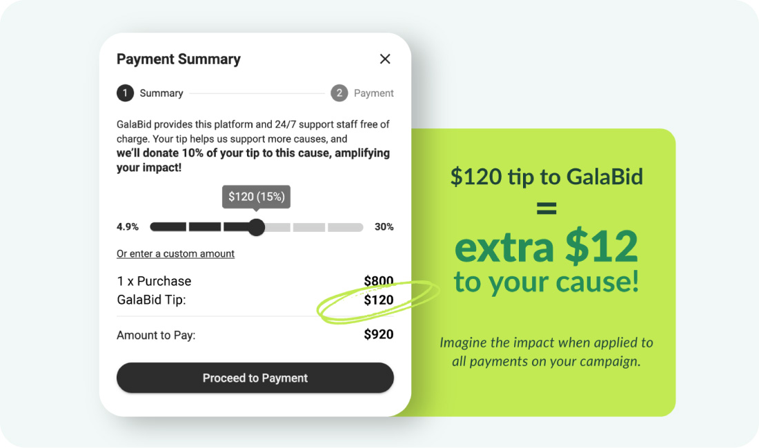 If you would like to see how the free platform with tipping option works on GalaBid you can can see the details and the paid pricing alternatives on our pricing page.